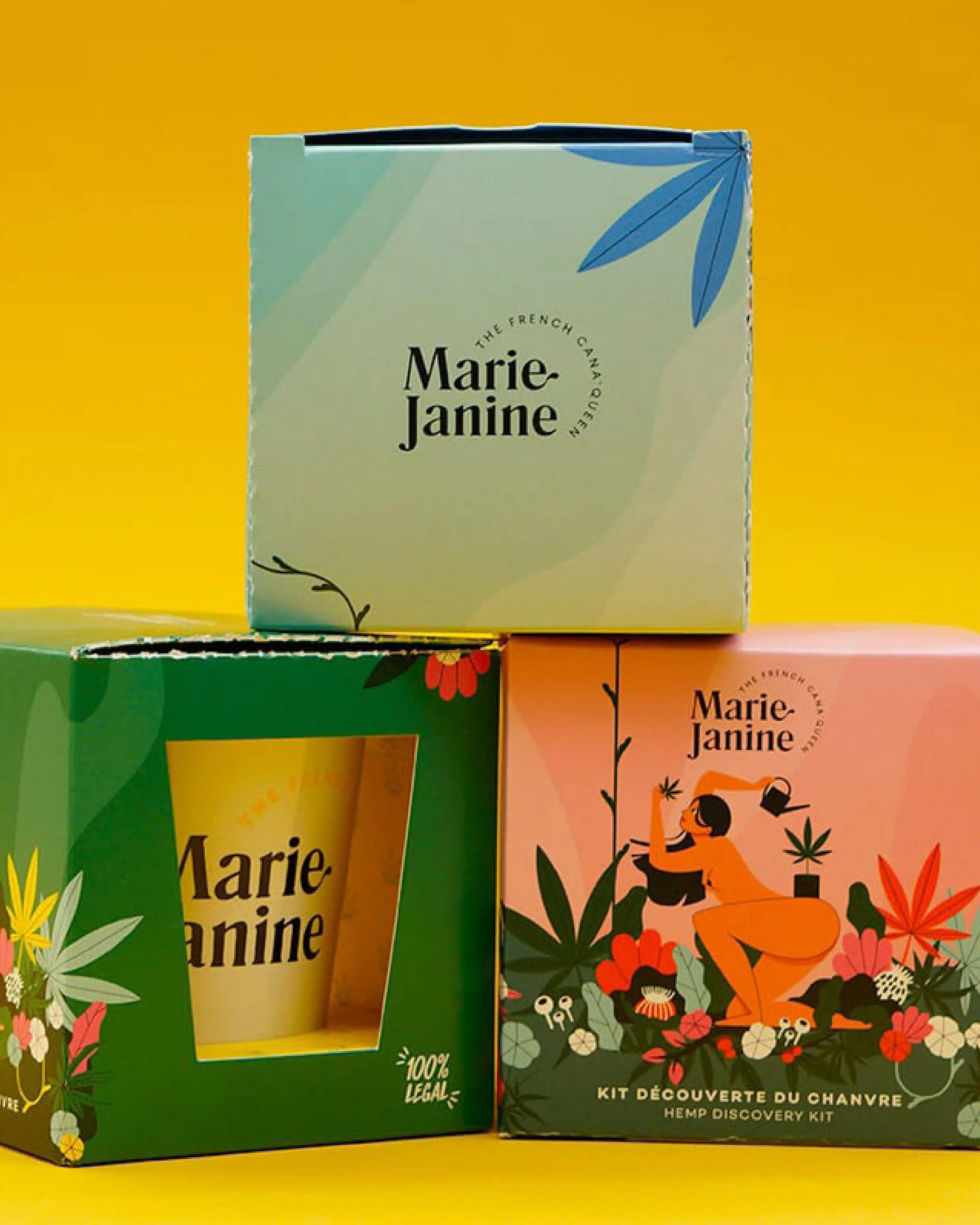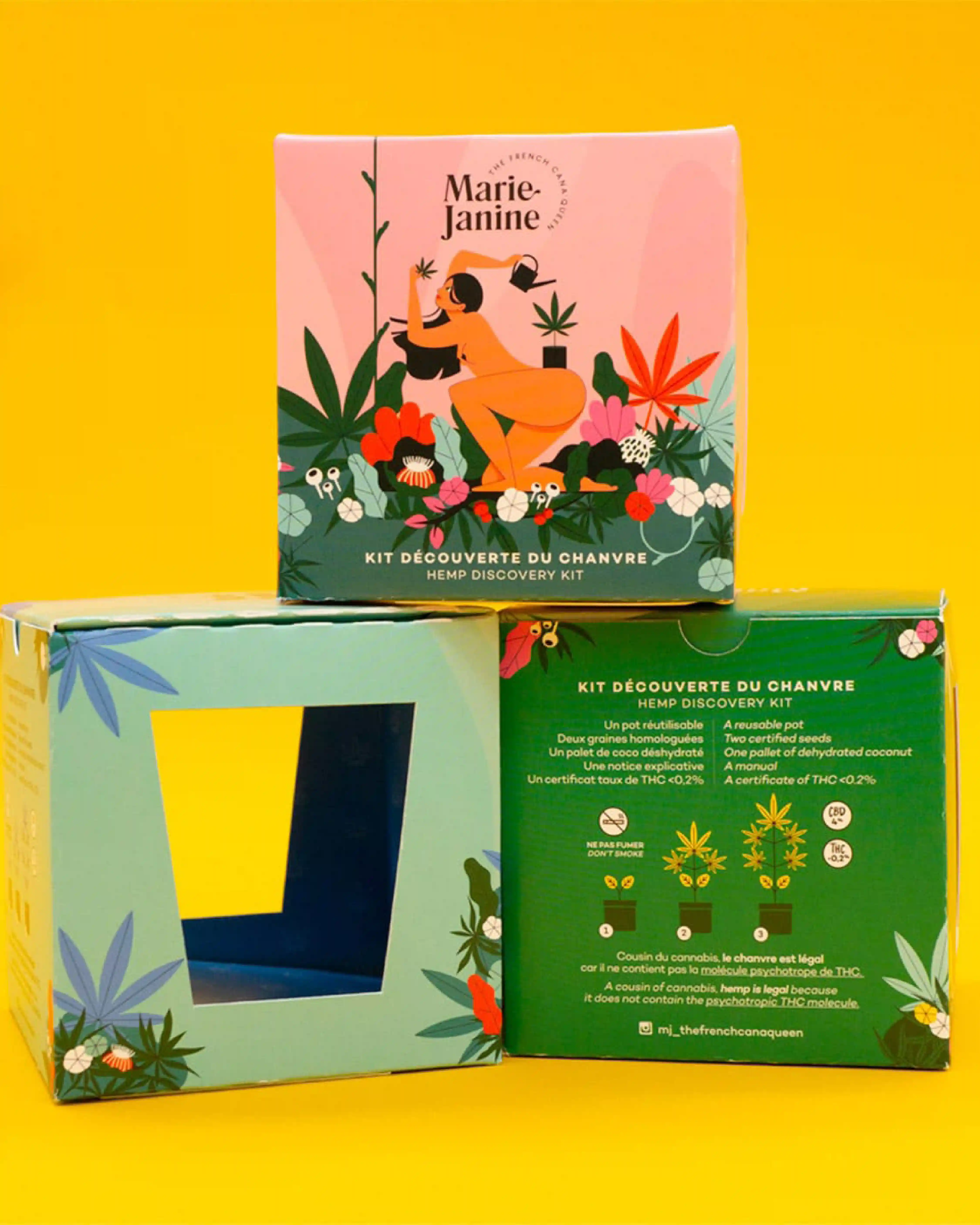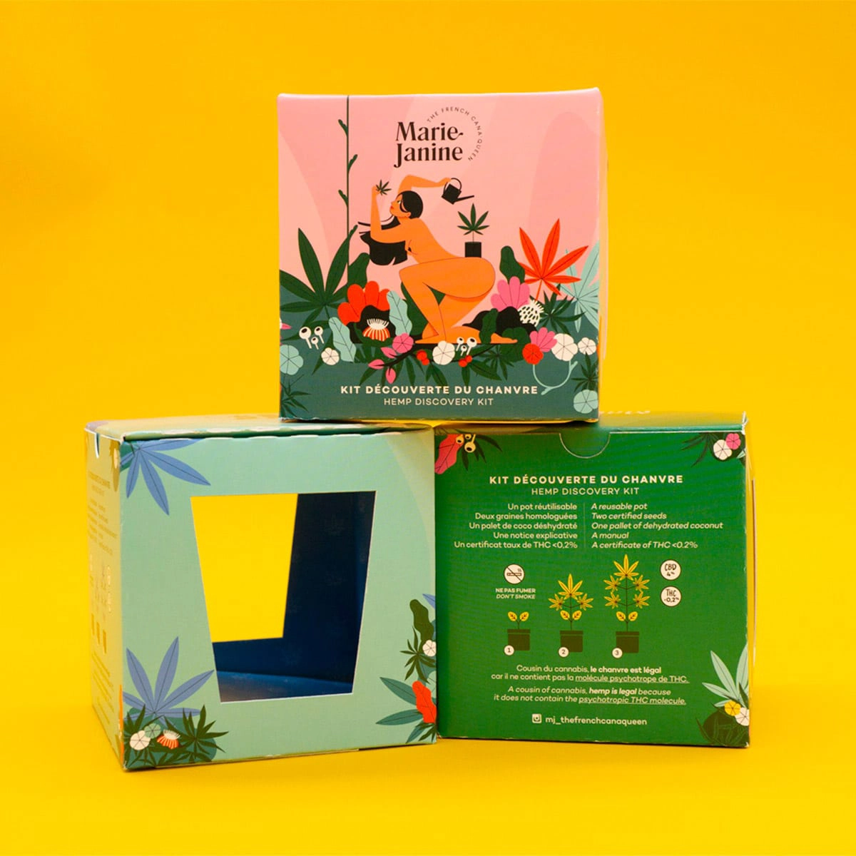 Marie-Janine, boutique spécialisée dans les kits de plantation chanvre a travaillé avec nous plusieurs contenants : boîtes découpée à la forme, boîte métal…