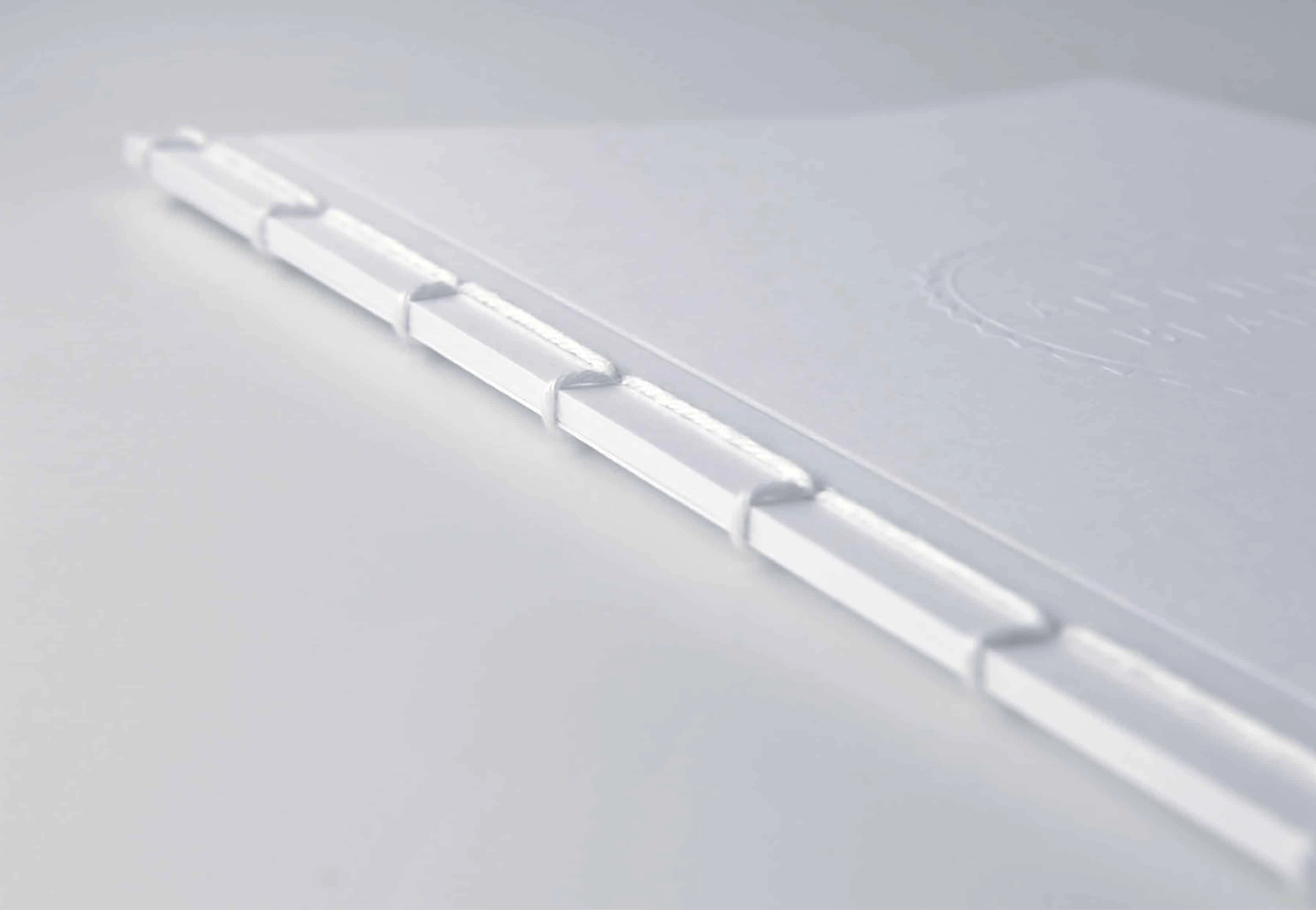 Sur le dossier de presse, un gaufrage sur la couverture en Sirio 400g, à l’intérieur du Sirio 100g imprimé en une couleur (du noir) dans lequel nous avons rapporté des tirages argentiques, reliure à la japonaise au coton blanc.