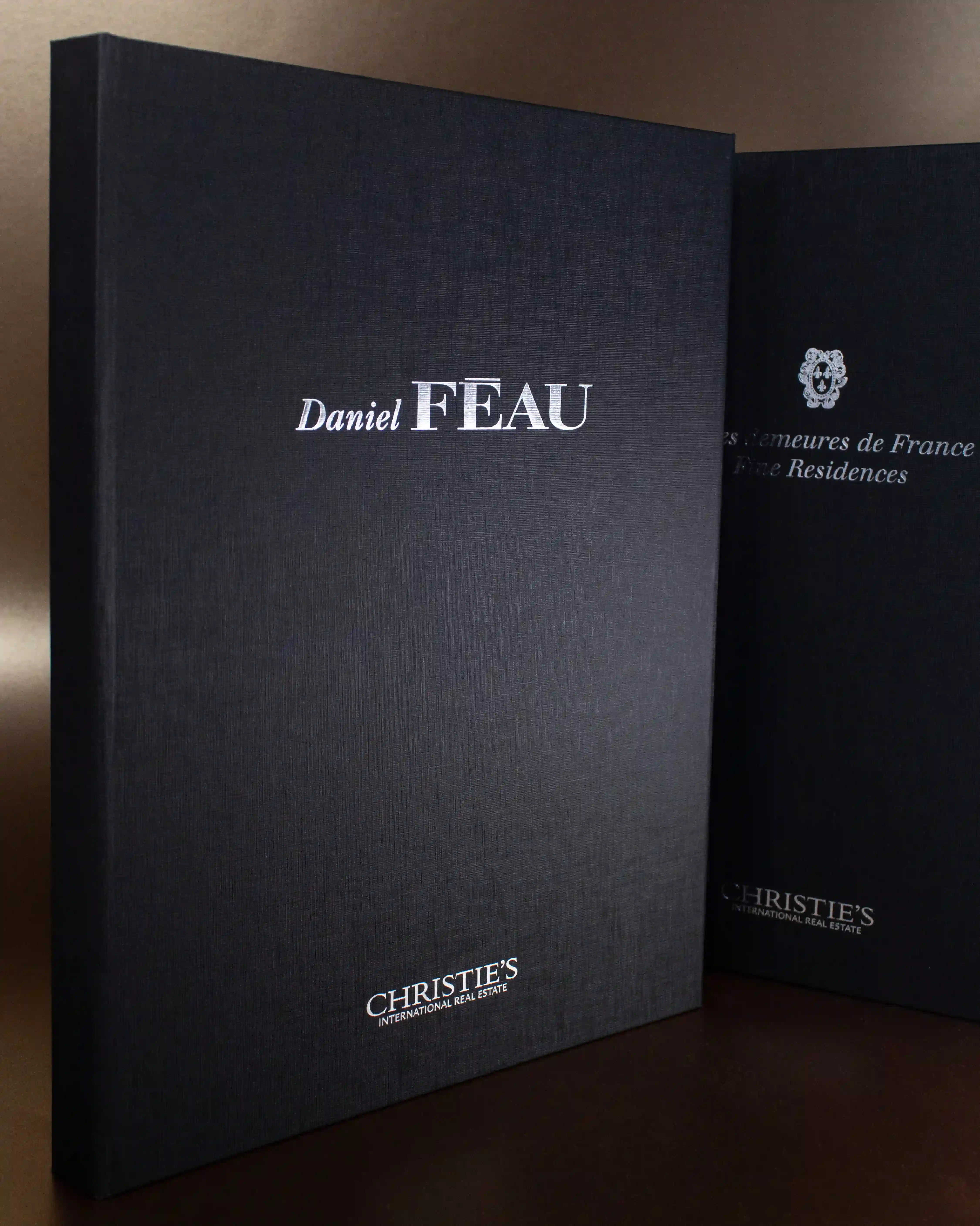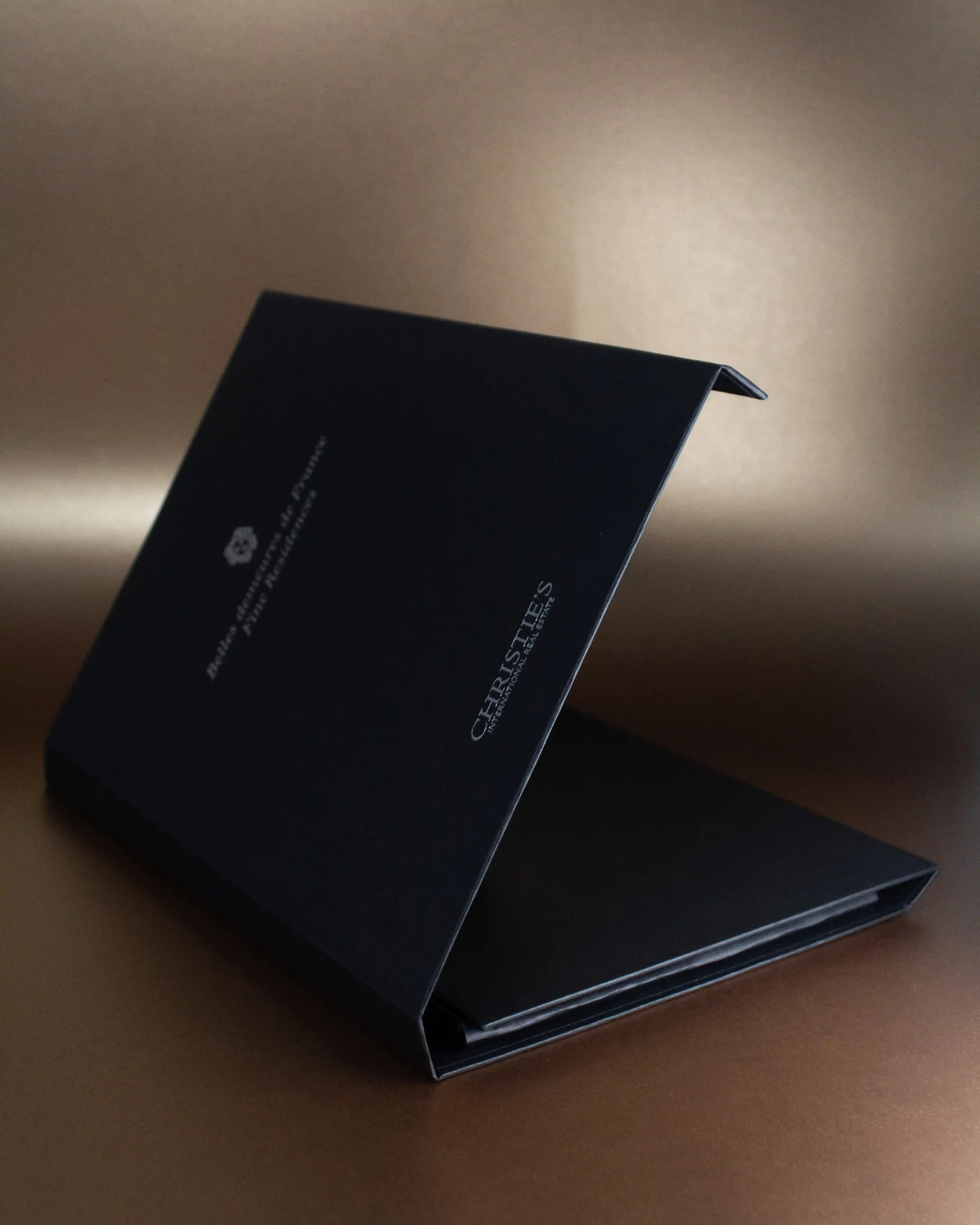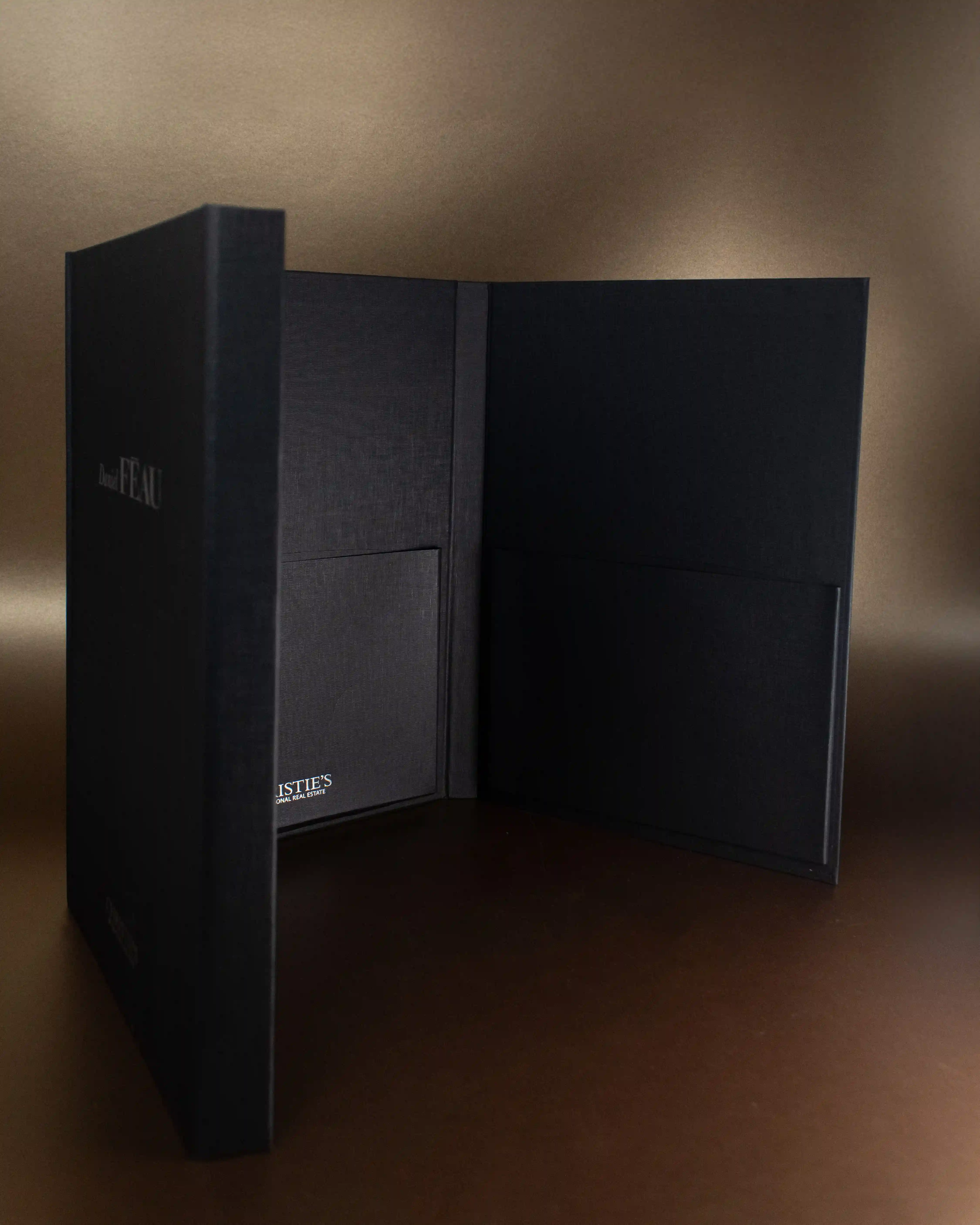 Fabrication d'un porte-document rembordé haut de gamme pour FEAU. Marquage à chaud argent sur une toile noire.